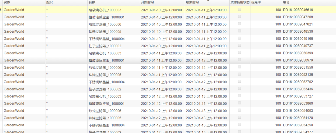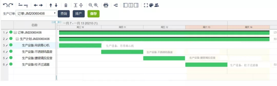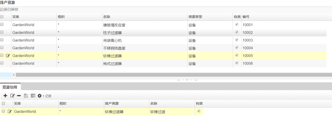可用的排產資源如下圖,設備提供的資源功用分別對應如下:搪玻璃反應釜---搪玻璃反應、柱子過濾器---柱子過濾、吊帶離心機--吊帶離心、不銹鋼結晶釜---不銹鋼結晶、鈦棒過濾器---鈦棒過濾、燭式過濾器---燭式過濾。