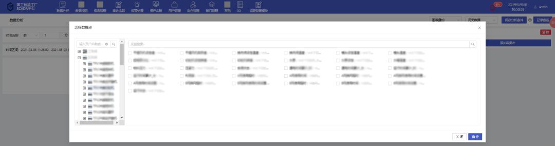 以某一特定設(shè)備為例,使用平臺(tái)數(shù)據(jù)分析功能,將平臺(tái)中的有效數(shù)據(jù)進(jìn)行分析。根據(jù)用戶的需要,對(duì)一段時(shí)間內(nèi)的歷史數(shù)據(jù)或?qū)崟r(shí)數(shù)據(jù)按照一定的統(tǒng)計(jì)頻率進(jìn)行多個(gè)維度的數(shù)據(jù)分析,統(tǒng)計(jì)頻率包含不限、10秒、30秒、5分鐘、10分鐘、30分鐘、1小時(shí),通過添加變量操作,在彈出的變量選擇彈窗中可多選數(shù)據(jù)點(diǎn)信息,可以通過資產(chǎn)樹選中資產(chǎn)來選擇數(shù)據(jù)信息或者直接通過模糊搜索查找數(shù)據(jù)點(diǎn)。數(shù)據(jù)分析得到的圖表顯示形式包括折線圖以及表格形式。多個(gè)數(shù)據(jù)點(diǎn)信息圖表的展示形式包括平鋪、疊加、標(biāo)簽顯示以及合并表格顯示,根據(jù)不同的需求選擇對(duì)應(yīng)的展示形式,靈活性高。數(shù)據(jù)分析幫助用戶分析用戶想要分析的內(nèi)容,如數(shù)據(jù)走向、問題等,從而幫助用戶解決問題。