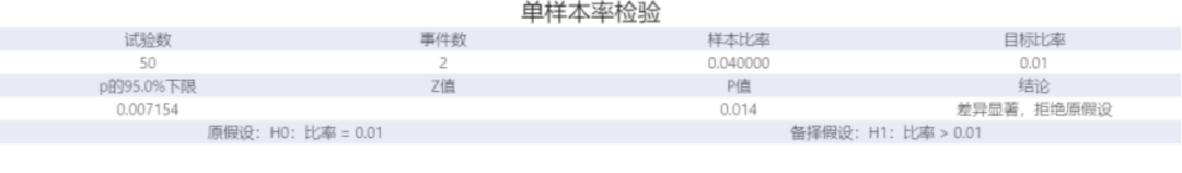 使用集成好算法的單樣本率檢驗分析組件(One-proportion)進行數據的單比率分析處理,根據單樣本率假設檢驗的檢驗流程:首先確定檢驗的問題為“手套的實際生產寬度是否符合外觀標準”。所以我們將零假設H0設定為手套的實際生產寬度不符合外觀標準,那么備擇假設H1即可設定為手套的實際生產寬度符合外觀標準。我們可以設想,若手套的實際生產寬度≥80mm,則在抽取的50只手套中應只有少量幾只手套的寬度小于80mm,如果出現大量手套寬度小于80mm,則我們有理由懷疑手套的實際生產寬度小于80mm。所以,我們假設在抽取的50只手套中僅有2 只不合格的概率為0.01,即設定實驗數為50,不合格事件發生數量為2,目標概率為0.01,如圖2所示。當然,即使該企業使用當前生產參數生產的手套寬度≥80mm,因為偶然因素導致我們剛好抽取了很多寬度小于80mm的手套的情況也不可避免,此時按照我們的邏輯要拒絕零假設,也就是我們判斷錯了,我們可以將顯著性水平(判斷錯誤的概率)設定為0.05,如圖2所示。