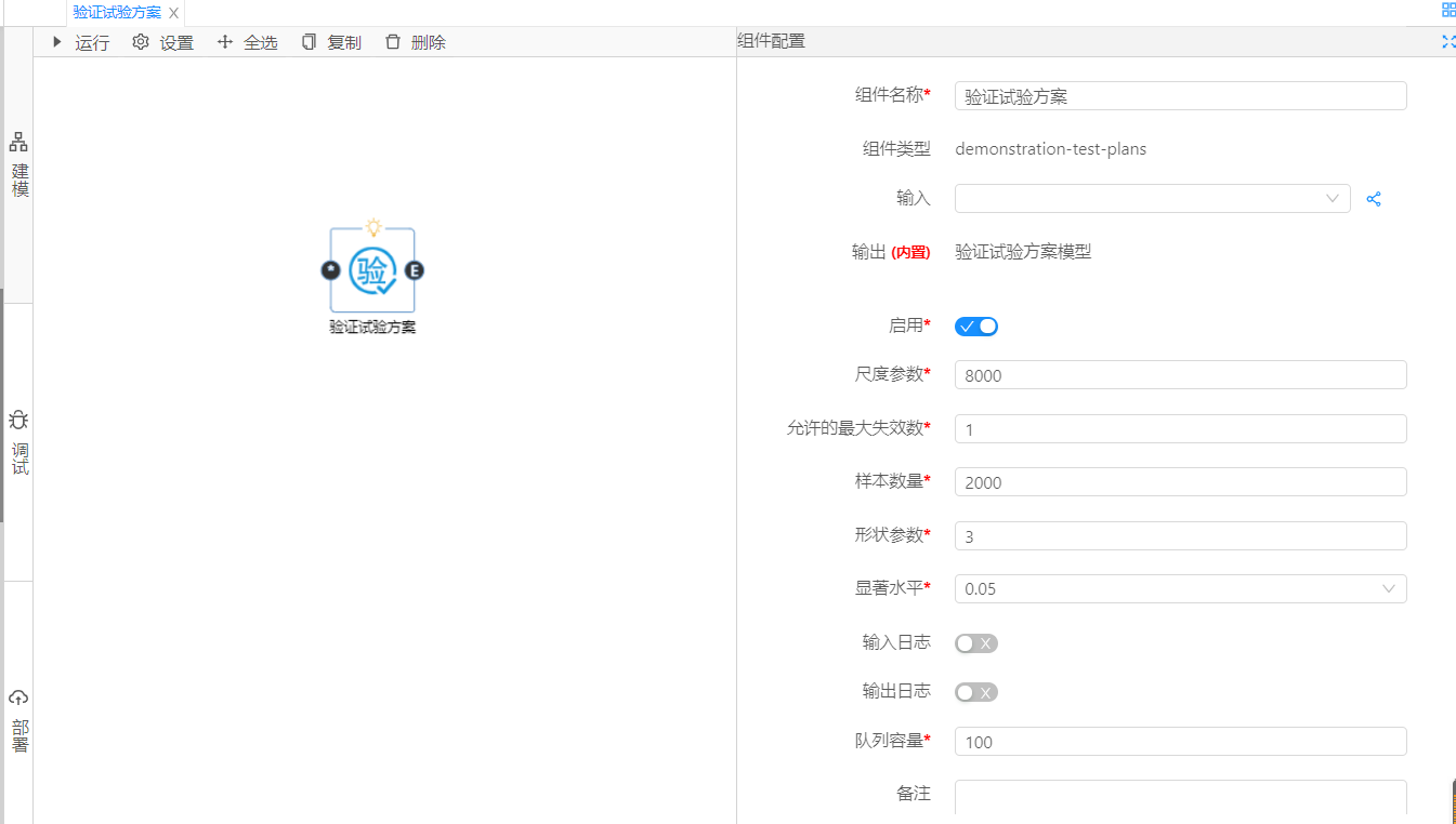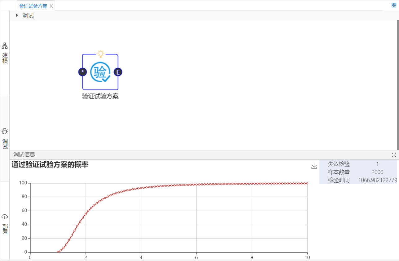 單擊該組件,右側會出現【組件配置】操作面板,進行一系列參數配置:將尺度參數設置為8000,允許最大失效數設置為1,樣本數量設置為2000,形狀參數設置為3,顯著性水平選擇0.05,單擊運行,從調試面板中查看分析結果。