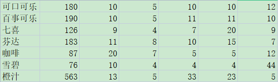 現(xiàn)有7種飲品,可口可樂,百事可樂,七喜,芬達(dá),咖啡,雪碧,橙汁。測試人員對(duì)其營養(yǎng)成分進(jìn)行觀測值聚類分析。