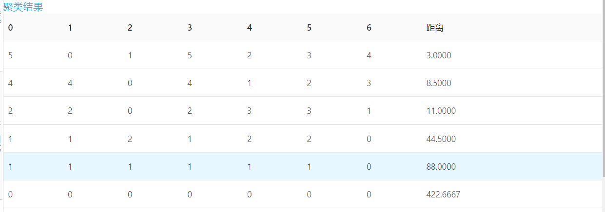 通過國工數(shù)據(jù)大腦分析平臺(tái)分析的聚類結(jié)果可以看出,如果想看聚2類找倒數(shù)第二行,0到5都是1分為一類,6為0作為另一類。如果想看聚3類找倒數(shù)第三行,0、1、3都是1,分為一類,2、4、5都是2作為第二類,6為0作為第三類。依次類推。