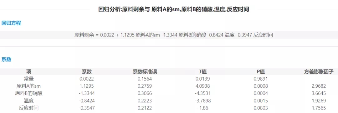 成本高低不僅影響著化工行業(yè)企業(yè)的利潤,更是其公司發(fā)展壯大的一個制約因素。某有機新材料企業(yè)想要減少化學反應(yīng)中的原料剩余并預(yù)測在某種反應(yīng)參數(shù)變量取值下的原料剩余。原料剩余越少,成本利用率越高。把我們想要研究的對象原料剩余(Y)作為因變量,選取了4個主要影響因素:原料A的SM(X1);原料B的硝酸(X2);溫度(X3);反應(yīng)時間(X4)。并進行22次試驗。基于22次實驗數(shù)據(jù)進行多元線性回歸。