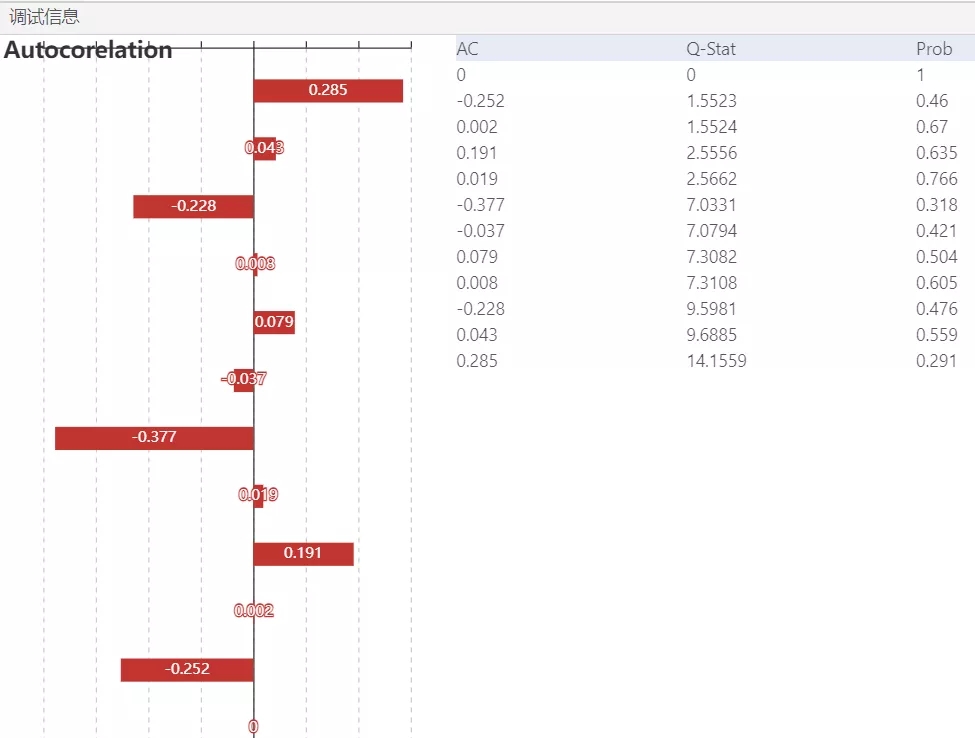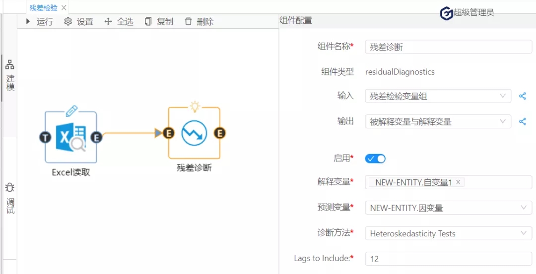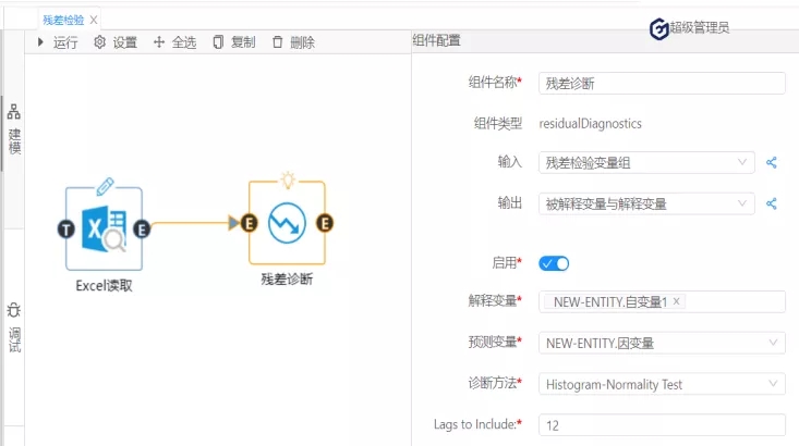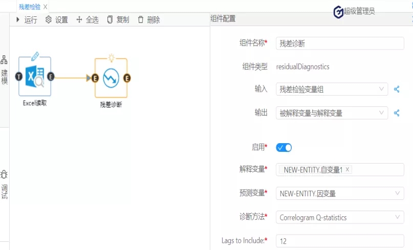 其次,在此基礎上,進一步使用數據大腦平臺的殘差檢驗算法判斷回歸模型的理想度。實現殘差檢驗第一個方面:序列相關性的檢驗。(原假設是:不存在序列自相關。)打開國工數據大腦平臺。從數據大腦中的組件面板搜索殘差檢驗組件,拖到到工作面板,配置數據及參數。在診斷方法下拉列表選擇:Correlogram-Q-statistics;滯后階數選擇:12。如圖6: