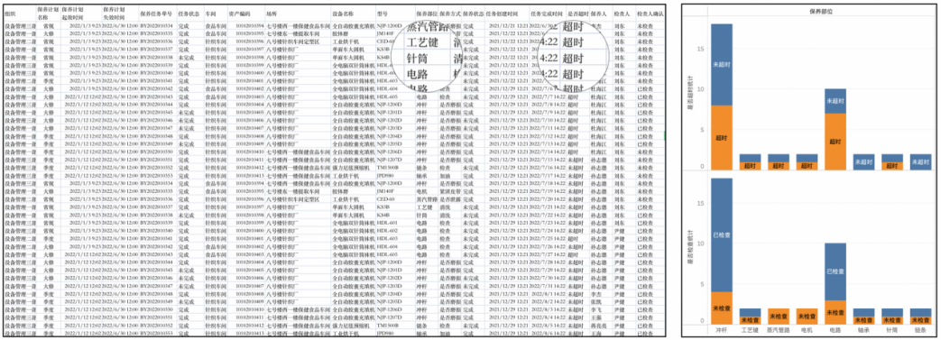 這還并不能體現(xiàn)出來可視化的最大價(jià)值,再回答一個(gè)問題:“保養(yǎng)部位中超時(shí)的多少是否與檢查人確認(rèn)有關(guān)?”針對這個(gè)問題通過表格給出答案已經(jīng)非常具有挑戰(zhàn)了,通常需要經(jīng)過編程或SQL來輔助完成計(jì)算的工作,但是類似這樣的問題會有很多,如:不同部門在不同車間中設(shè)備保養(yǎng)狀態(tài)與生產(chǎn)產(chǎn)量之間的對比情況如何?
