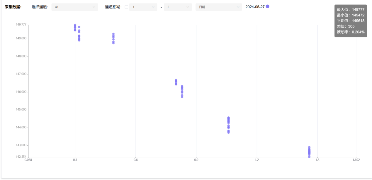 由上圖可知,含水量在1500nm波段有明顯的相關(guān)性,相關(guān)性高達(dá)0.95,且躁信比較低,為0.82。通過檢查該波段的落點圖,發(fā)現(xiàn)有較好的線性關(guān)系,落點圖如下圖所示: