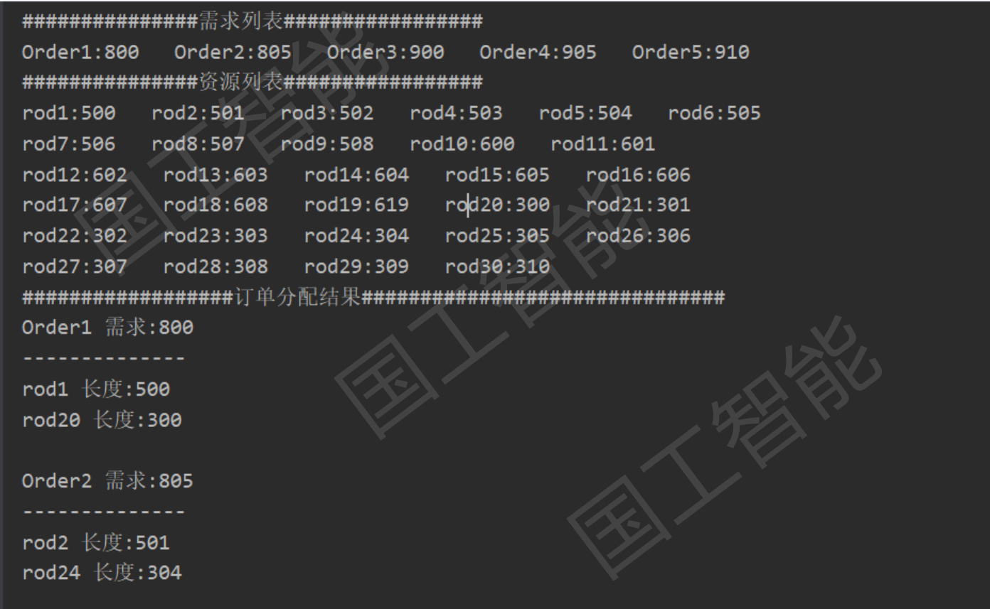 根據客戶的這個業務場景和解決思路,公司研發人員部建立了一個業務Demo。創建 5個需求,30個硅棒作為現有倉庫存儲,需求的長度必須滿足,可超長,但超長的長度不可超過10,超長部分越少越好,可拼接,但是不能超過3個,拼接的個數越少越好。(在這里為了演示的可閱讀性,假設硅棒的原料相同,硅棒的截面規格也相同,只有長度不同,長度單位為毫米,下文在描述時對單位做了省略。)