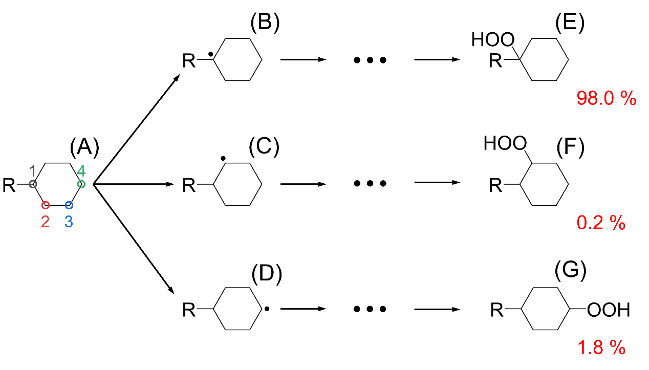 例如,在圖1所示一個經典的工業催化反應體系中,底物A會在不同反應位點(1,2,3和4)上發生反應,最終在實際生產中表現為不同產物的選擇性差異:如圖1所示,1號反應位點對應的產物E選擇性為98.0 %,2號反應位點對應的產物F選擇性為0.4 %,4號反應位點對應的產物G選擇性為1.6 %,實驗未能檢測到3號反應位點對應的產物。