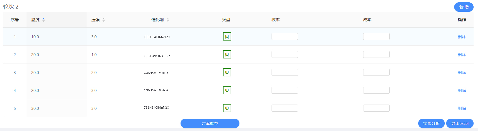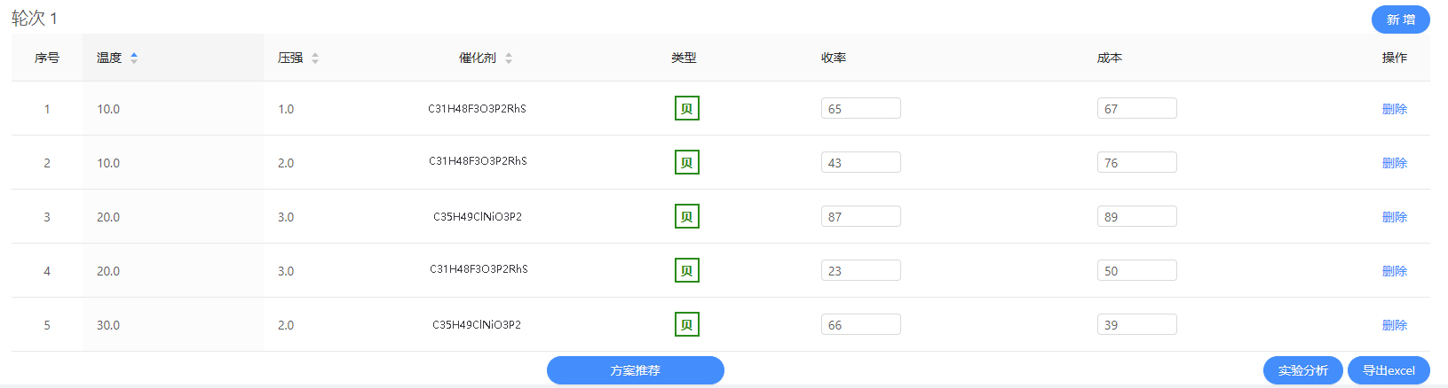 其次,實驗信息配置完成后,即可開始進行算法優(yōu)化。在首輪沒有歷史數(shù)據的情況下,需要隨機從搜索空間中生成用戶指定個數(shù)的初始樣本,這里以5個為例,如圖3為輪次1的信息,這里的收率及成本實際值需要做實驗進行回填,用戶也可以根據自己的需求刪除一些樣本。