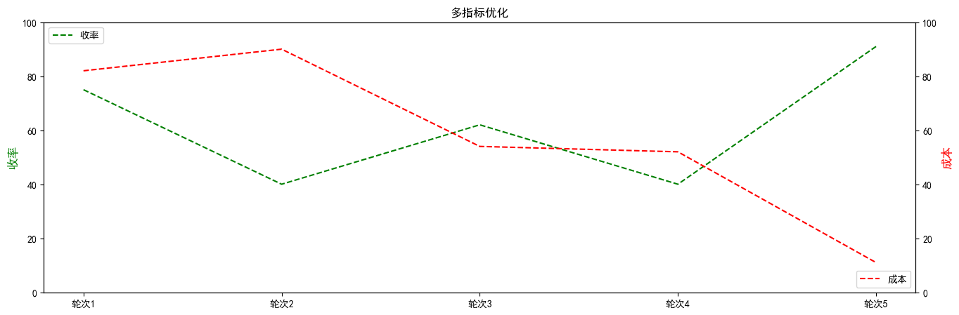 下圖為本示例最終推薦效果的可視化展示,取出每輪推薦方案中指標值較優(yōu)的點繪制折線圖,雖有所波動,但收率整體上朝著最大化的方向進行優(yōu)化,同時成本也在逐漸最小化,并在第5輪推薦方案中二者均達到了可以接受的水平,證實了該算法的有效性。