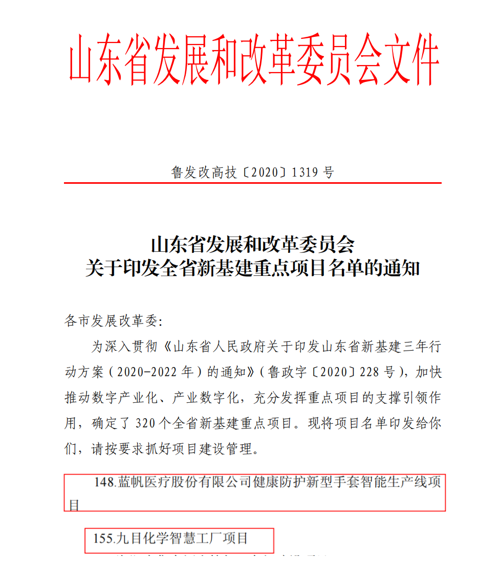近日,山東省發(fā)展和改革委員會(huì)印發(fā)了全省新基建重點(diǎn)項(xiàng)目名單的通知,其中由國(guó)工智能負(fù)責(zé)承建的兩個(gè)智慧工廠項(xiàng)目被列為山東省新基建重點(diǎn)項(xiàng)目,分別是藍(lán)帆醫(yī)療股份有限公司健康防護(hù)新型手套智能生產(chǎn)線項(xiàng)目和九目化學(xué)智慧工廠項(xiàng)目。